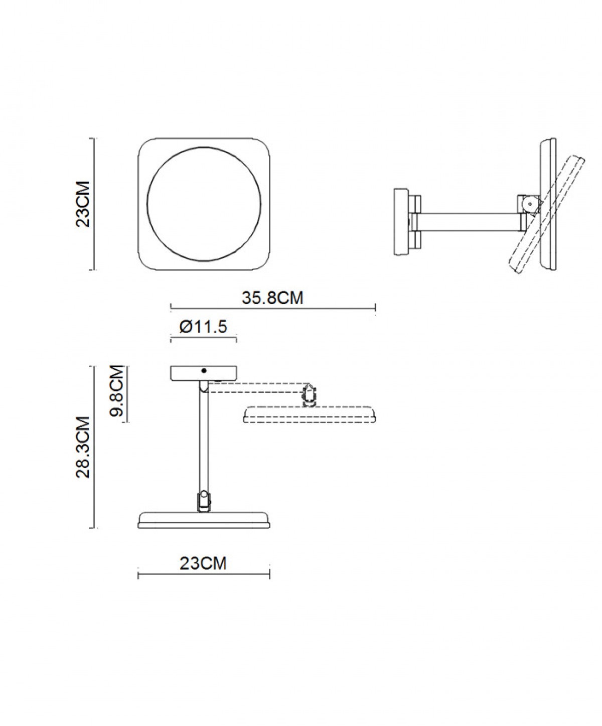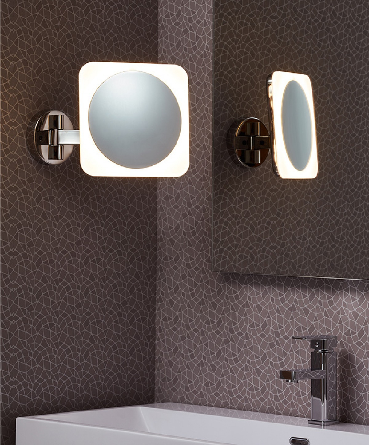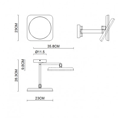 El espejo cosmético se fija directamente en la pared. Su brazo articulado le permite orientarse y puede dirigirse hacia la posición ideal para así reproducir su reflejo iluminado con un aumento de 3,5x.
